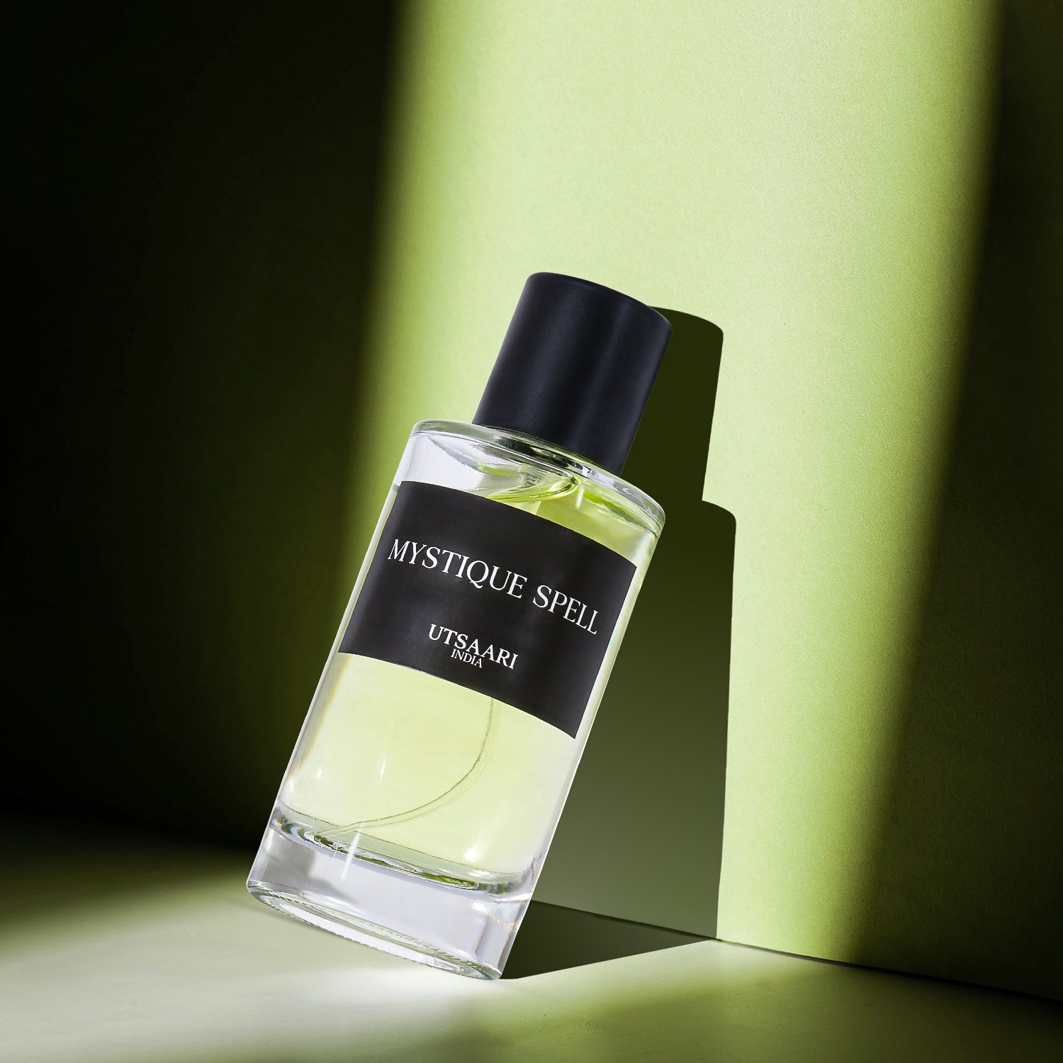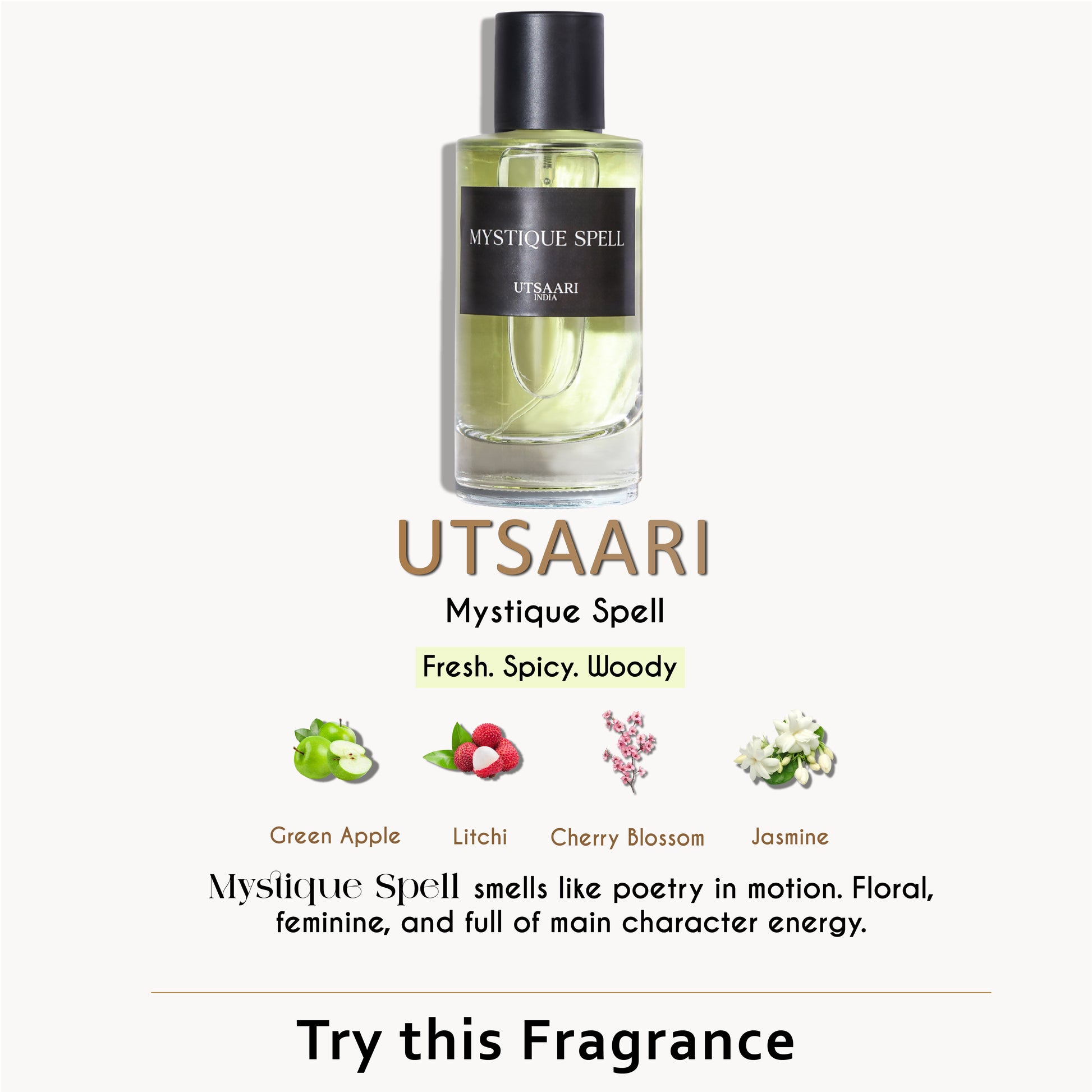 Mystique Spell is a fragrance that captures the essence of a perfect moment. It begins with the crisp, fruity notes of Green Apple, Litchi, and Orange, offering an invigorating and sweet start. The heart unfolds with the soft, floral scent of Cherry Blossom and Rose de Mai, adding a gentle, romantic touch. Finally, Musk and Jasmine in the base create a smooth, warm finish that lingers just enough to leave a lasting impression.
